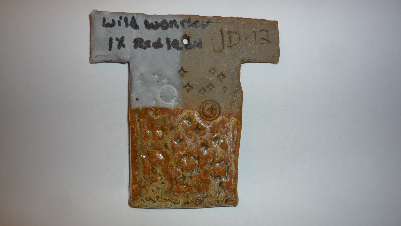 This is a cool pearly pink and lavender glaze. I'm a purple fanatic so I was pleased to see this tile come out of the kiln.  I think it compliments the clay body nicely, too.  Breaks along the edges to reveal the clay color. This glaze was applied pretty thickly to the tile. If not applied thickly, it seems it would appear more gray and dull in color.  The color is a more deep magenta on the textured side of the tile.
